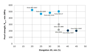 To evaluate the potential for using a duplex alloy in a PHE, the key parameter is its forming properties. Duplex stainless steels have a lower formability than most austenitic grades, with a fracture elongation of about 25% versus 40%. More ductile duplex alloys, such as Forta FDX 27 (1.4637, S82031), utilize the Transformation Induced Plasticity (TRIP) effect to further improve their formability to a level approaching austenitic alloys. However, its corrosion resistance is not always suitable for harsh conditions.