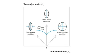 Rather than looking only at elongation, a forming limit diagram (FLD) is a better tool to assess the formability of complex metal sheet. This diagram illustrates the three main forming conditions of plane strain, stretch forming, and deep drawing, as shown in Figure 3.