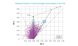 The complex shape of a PHE plate is really challenging for material performance. The formability would be typically highest when biaxially strained, and lowest in the plane strain condition. Therefore, complex plates often fail under this condition. The sheet thickness also influences the formability – a thinner gauge depresses the FLC. This brings further challenges when using a duplex grade, considering that its higher strength enables a reduction in plate thickness.
