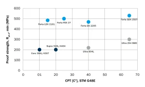 Therefore, when designing a PHE for harsher environments, we need to ask if conventional Forta DX 2205, or even super-duplex Forta SDX 2507, offers a suitable alternative to the more expensive high-alloy austenitic grades? The critical material properties of duplex and austenitic grades are illustrated in Figures 1 and 2.