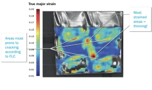 Figure 6 shows the strain measurements, indicating that the area most prone to cracking is in the bottom radius of the protrusion in the rolling direction of the sheet, where plane strain conditions prevail. The margin of failure is about 5% strain. However, the most strained area is located at the end point of the ridge where thinning has occurred due to stretch forming conditions. Yet, the margin of failure is about 15% strain. A common guideline is to include a safety margin of about 10 to 15% strain below the FLC to avoid failure.